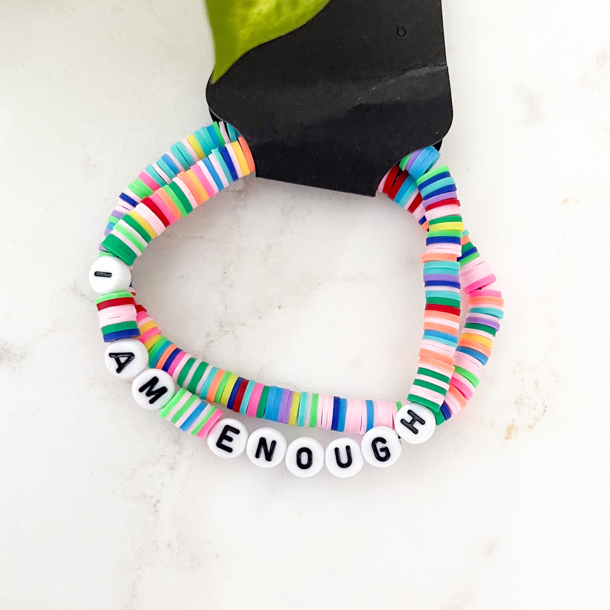 Colorful and sure to inspire those good, good vibes, this bracelet set comes with two bracelets, one with the empowering words "I AM ENOUGH" and the other a colorful companion bracelet to wear together or separate.